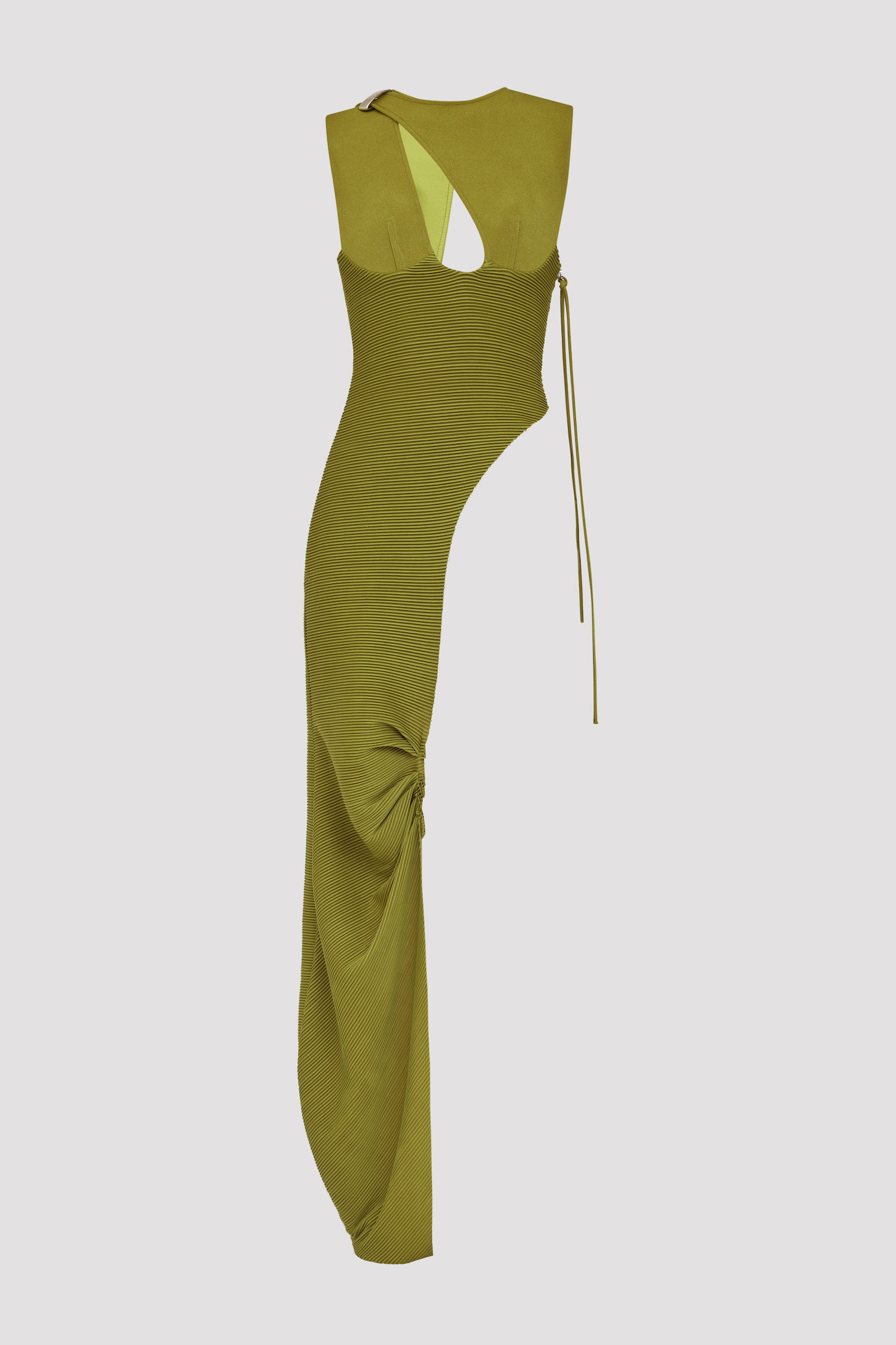 an asymmetric overtop with a ruched-leg detail. crafted from ribbed jersey and suiting crepe in muted chartreuse. made in vietnam