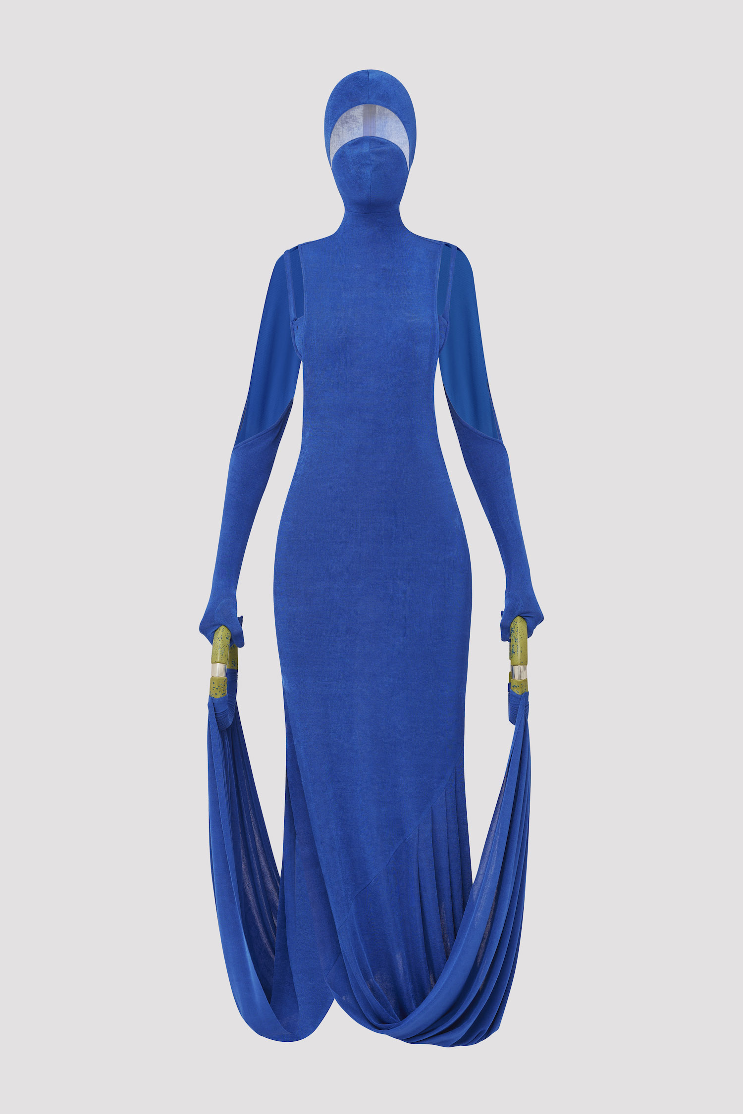 masked tank midi dress with lacquer painted wooden rings holding draped hemline. crafted from jersey knit silk.