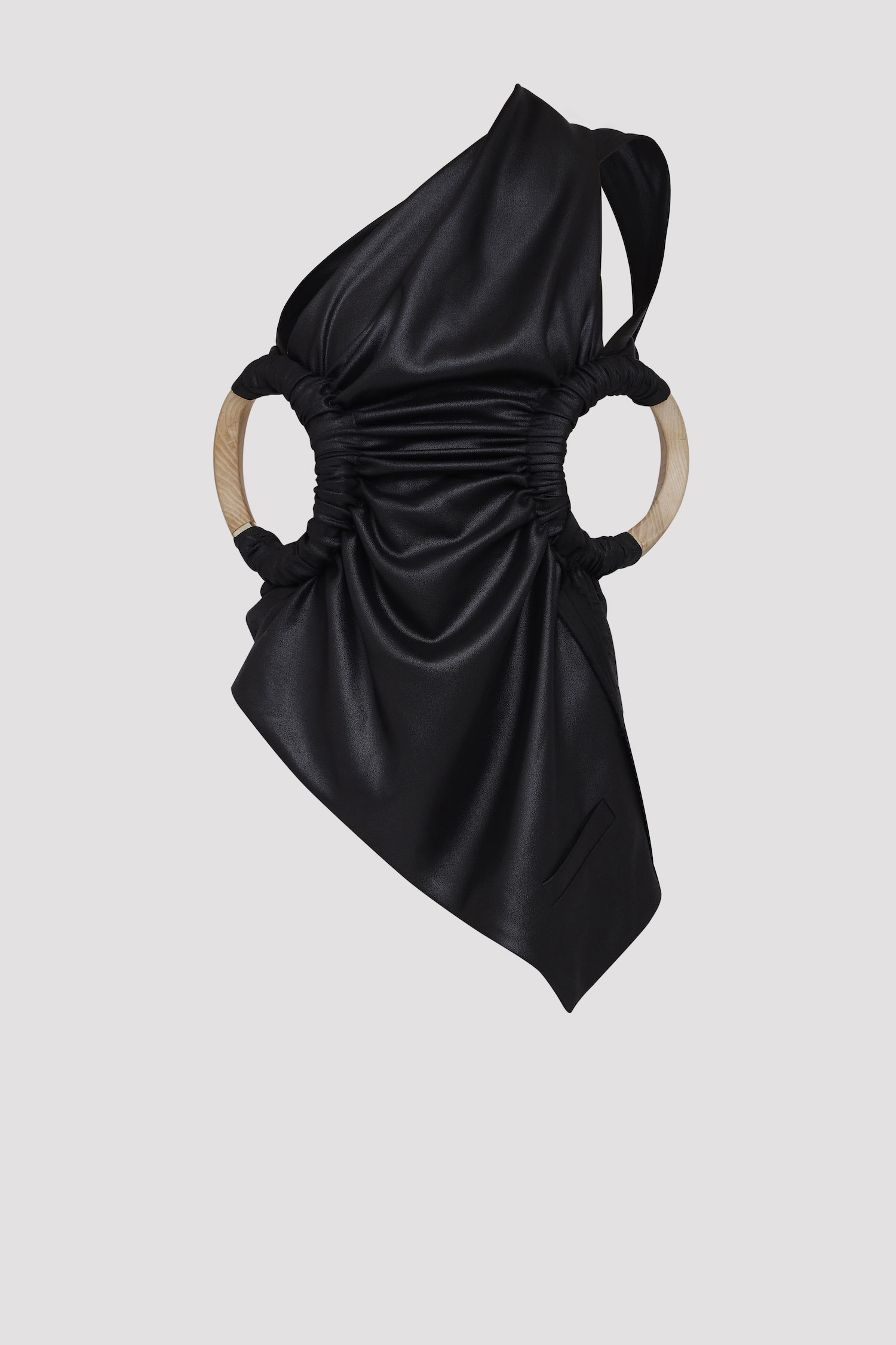 asymmetric ruched top with wooden ring attachments. crafted from metallic crepe in oil black.