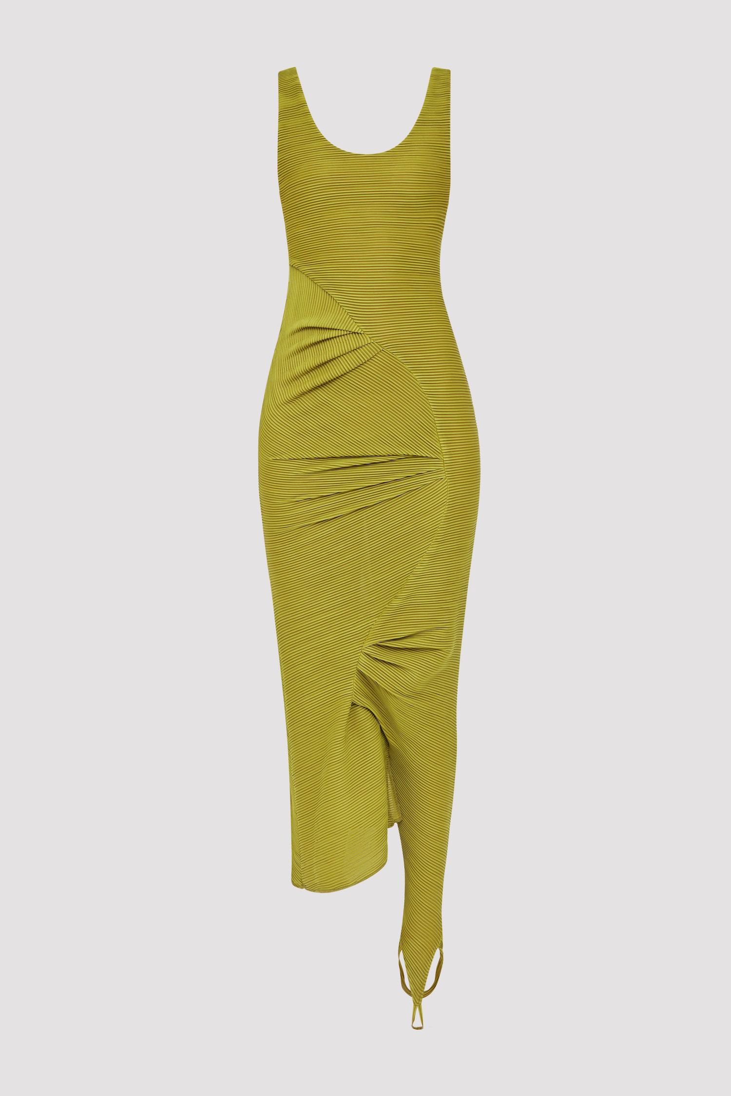 a asymmetric draped tank dress with ruched-legs details. crafted from ribbed jersey knit in muted chartreuse