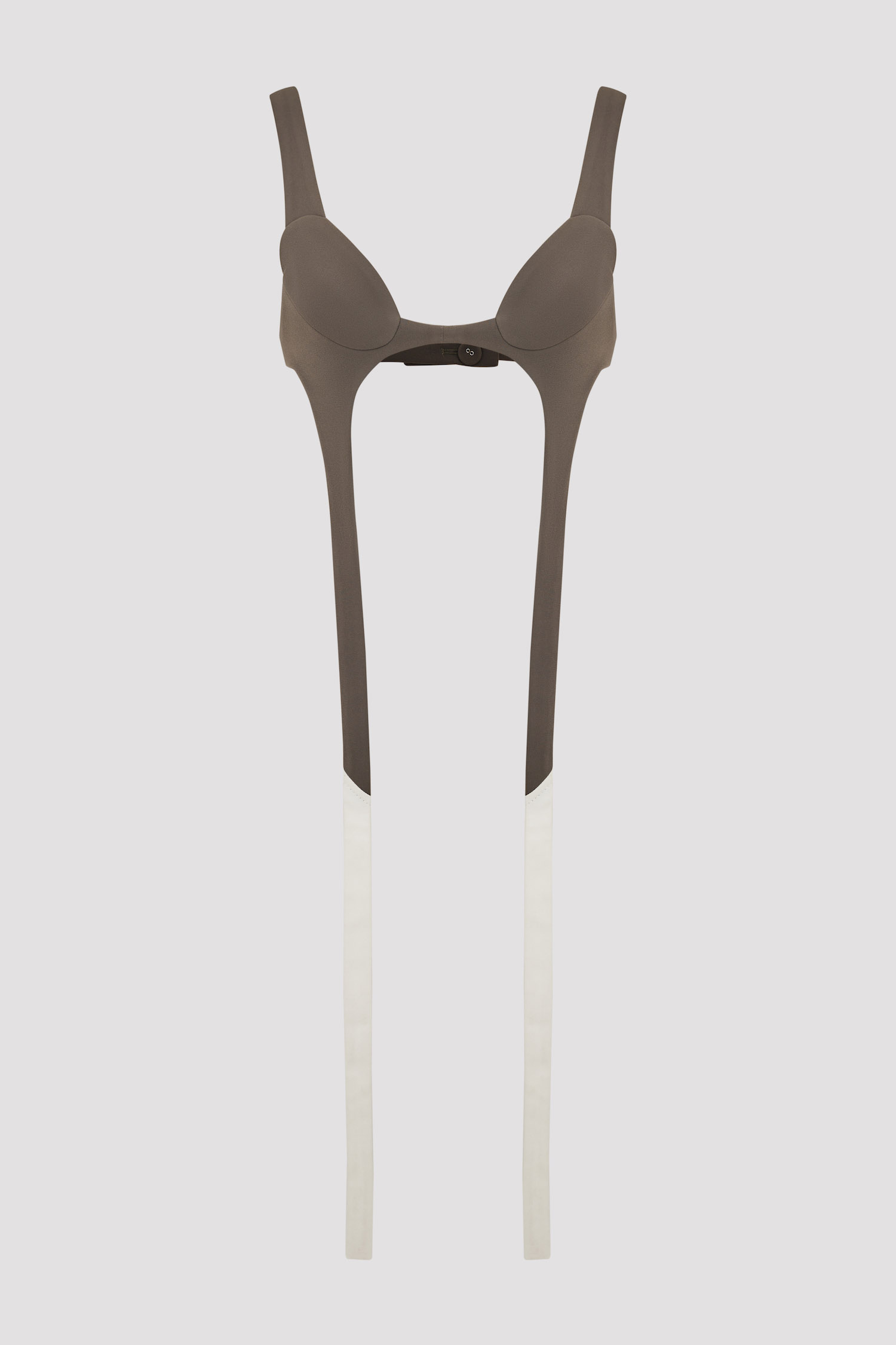 a grain-shaped bralette with elongated straps. crafted from smooth-surface crepe in duo-tone ash brown and white.