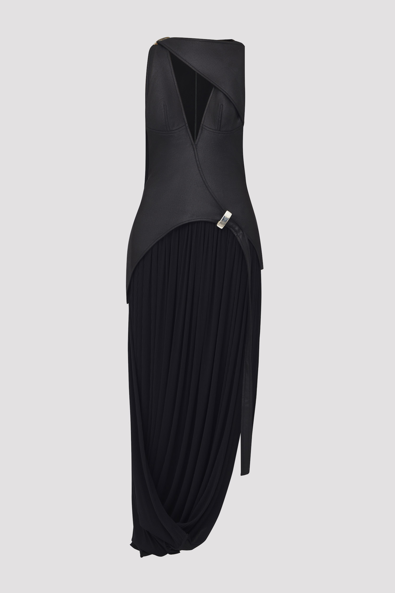 a deconstructed tank dress with plunging neckline and curved hemline. crafted from metallic crepe and jersey knit.