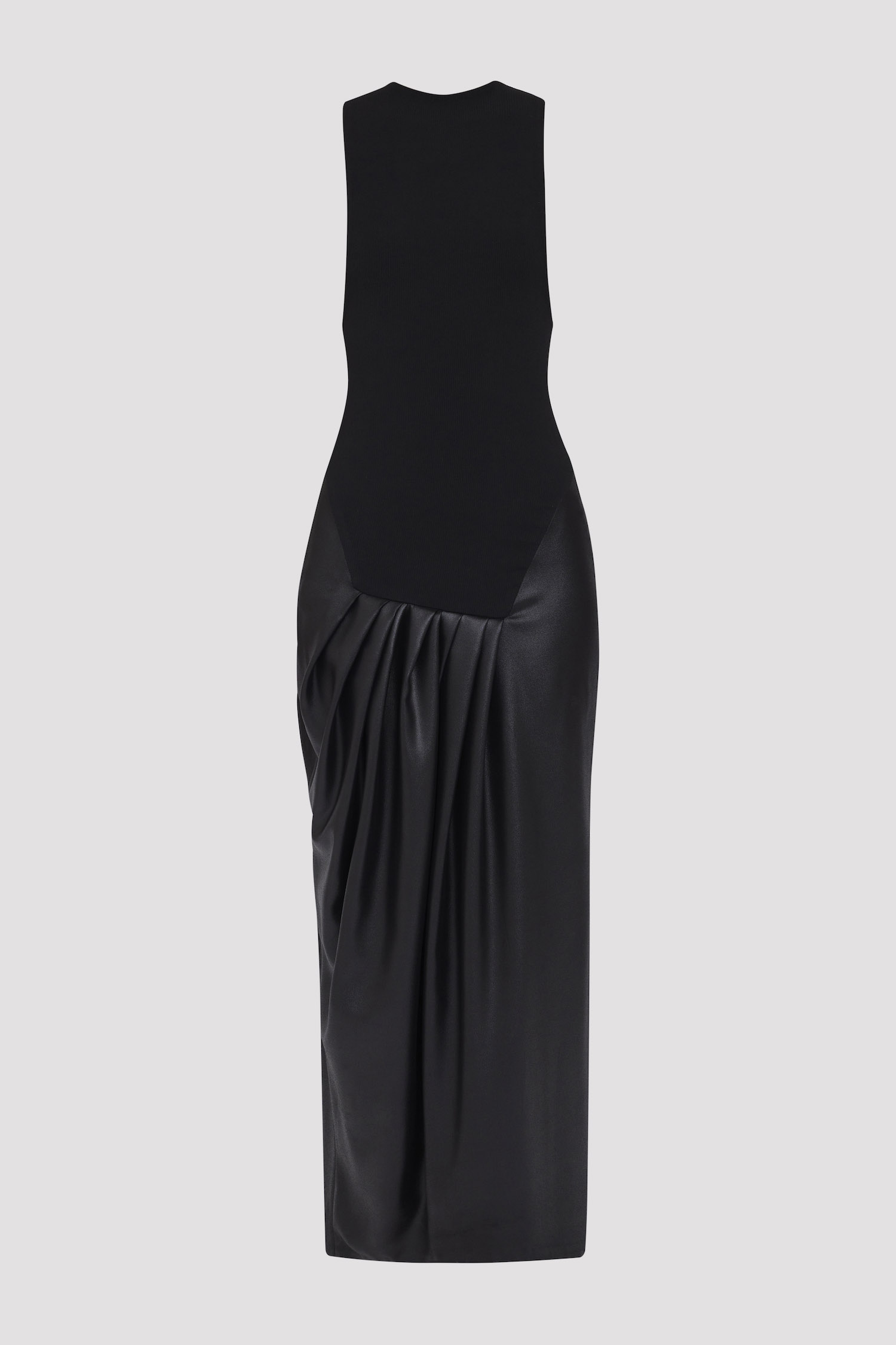 a tank dress with plunging arms and asymmetric pleating at the front. crafted in metallic crepe and jersey knit in black.