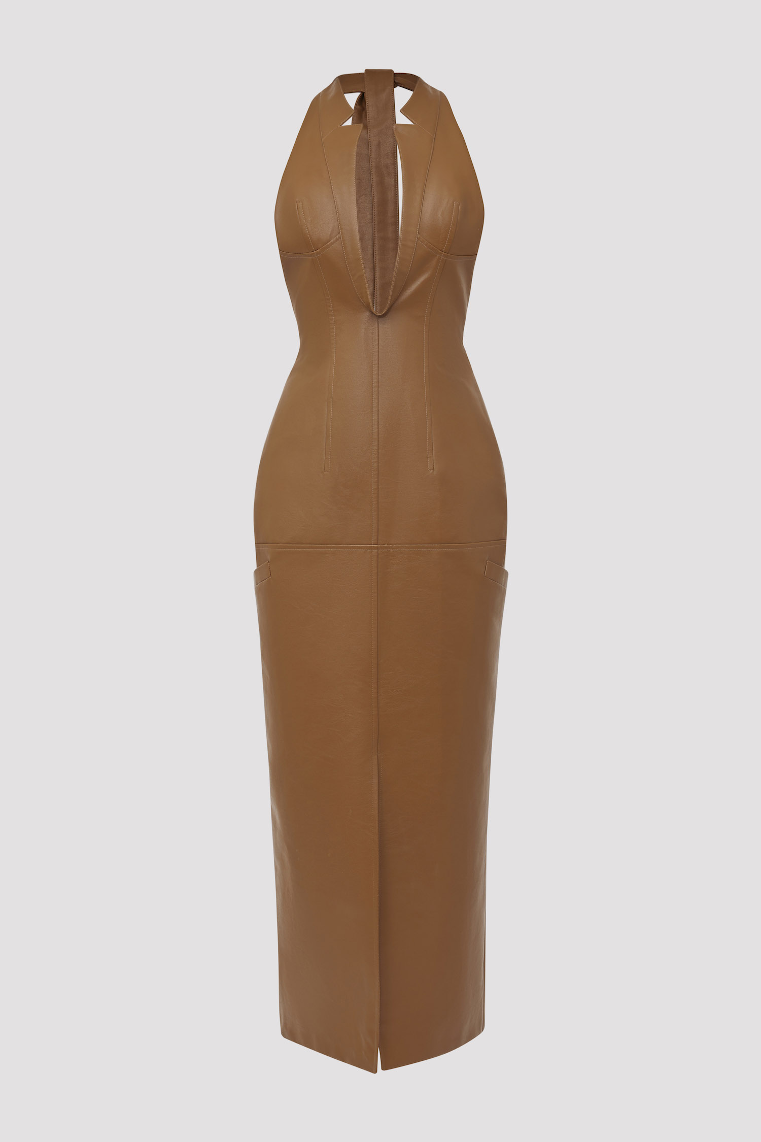 a midi dress with a plunging lapel neckline and front slit. crafted from faux leather in brown.