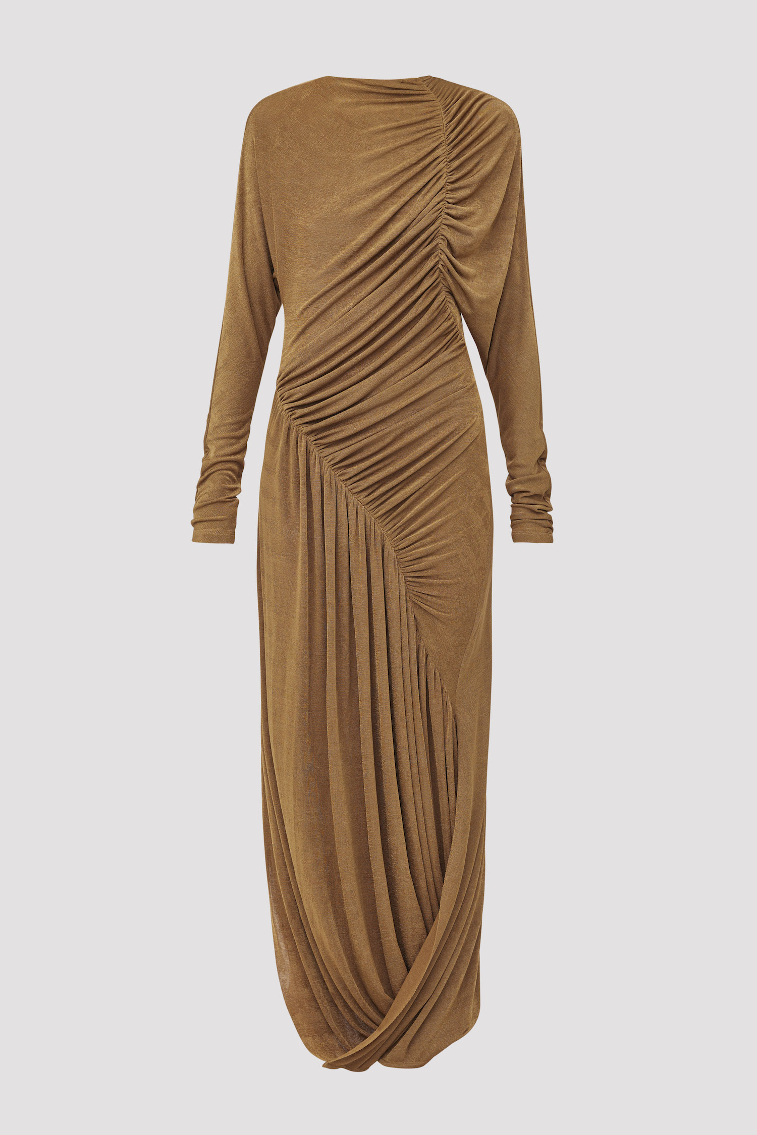 a midi longsleeve dress with a curled hemline and full-body ruching. crafted from jersey knit silk in ash brown.