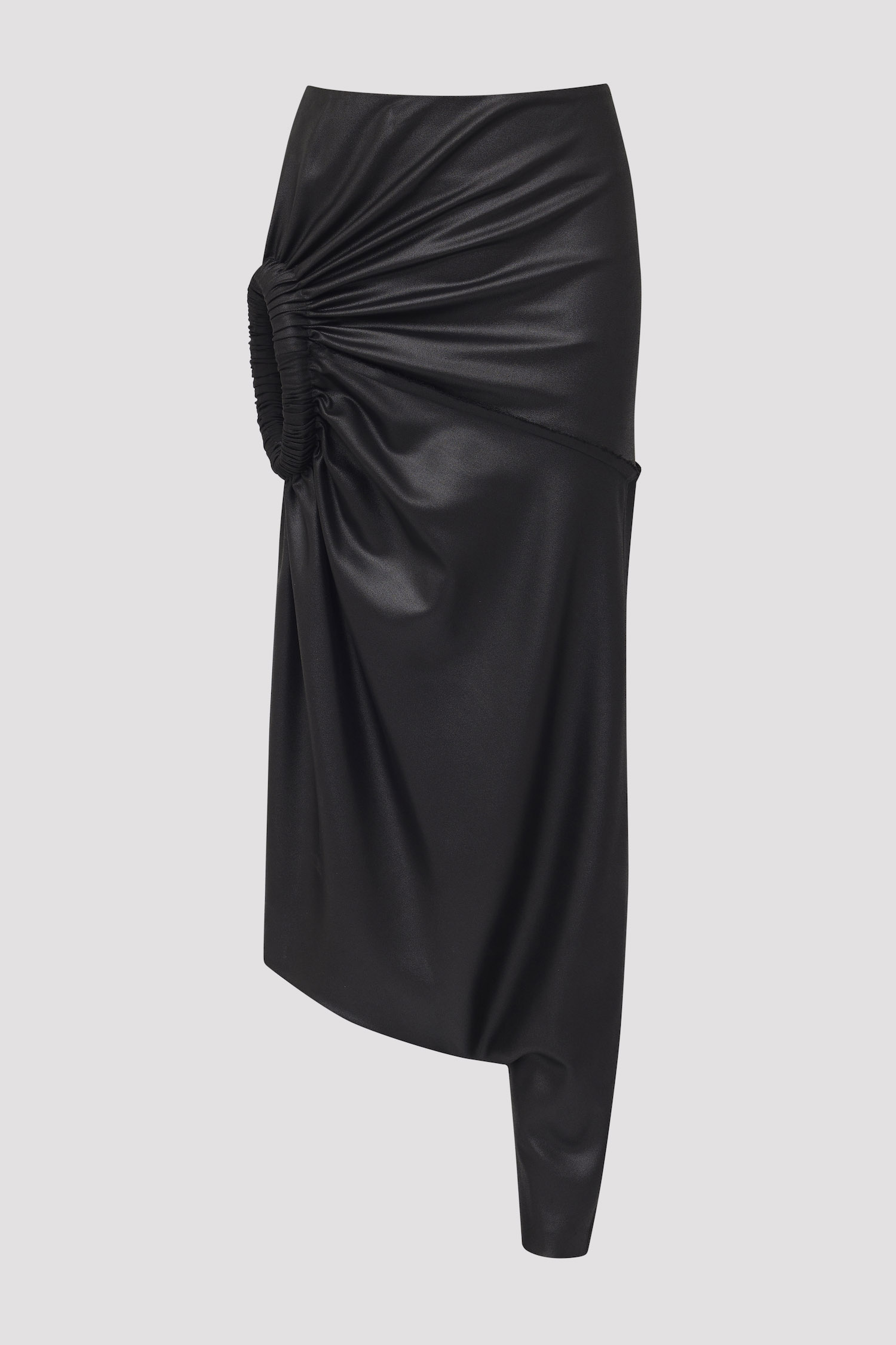 a single-ring ruched asymmetric skirt with leg detailing. crafted from metallic crepe in oil black.