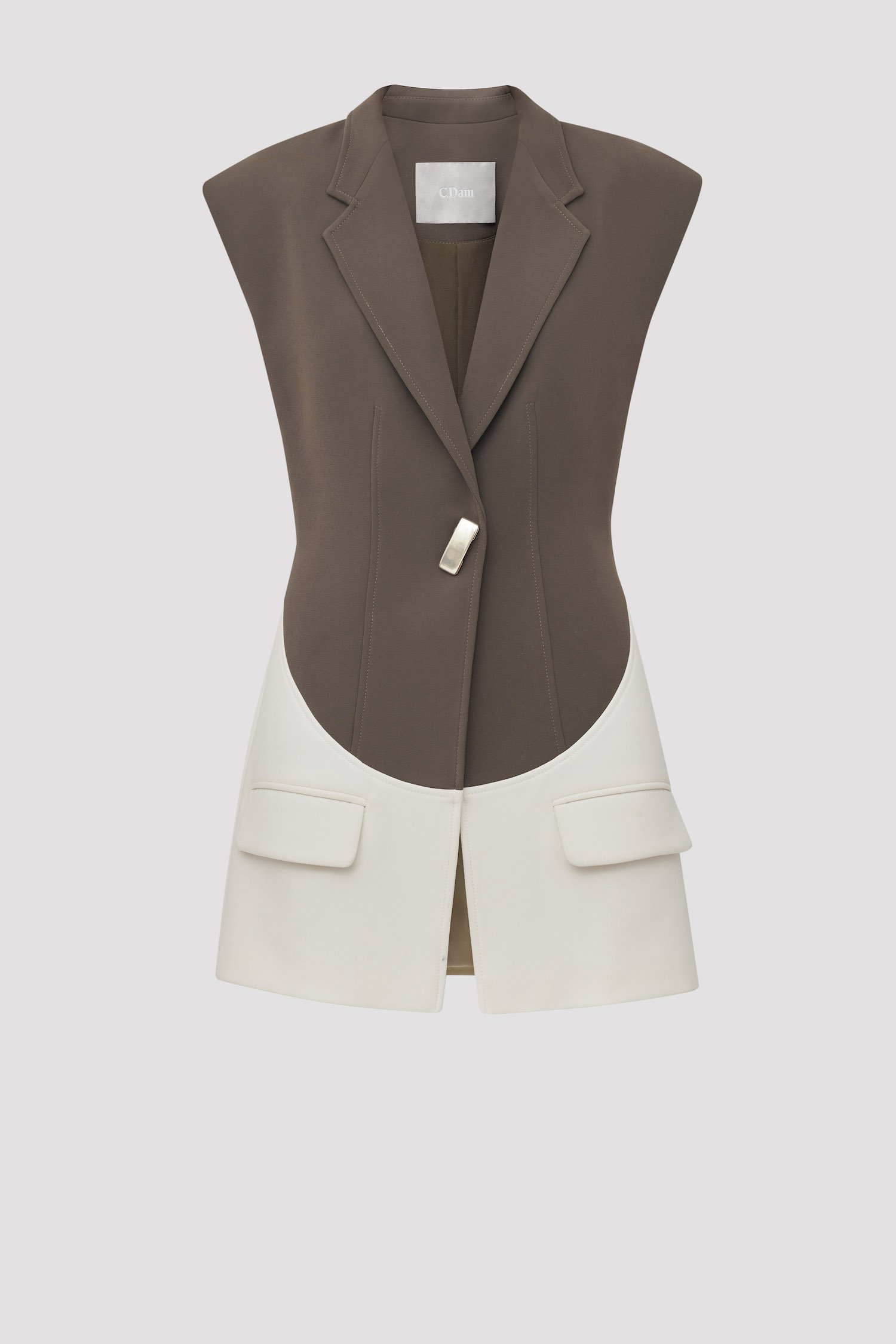 a sleeveless blazer with decorative stitiching and metal detailing. crafted from smooth-surface crepe in ash brown and white.